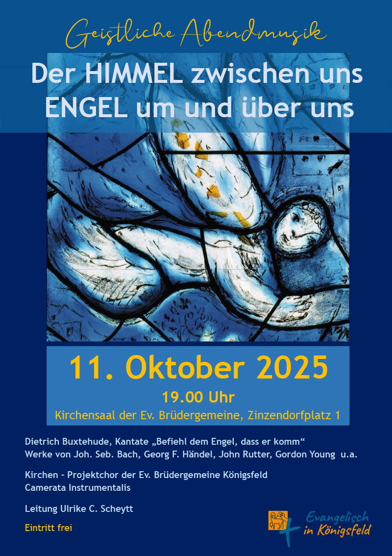 Am 11. Oktober um 19 Uhr findet ein Konzert statt. Bei „Der HIMMEL zwischen uns, ENGEL um und über uns“ werden neben der Kantate „Befiehl dem Engel, dass er komm“ von Dietrich Buxtehude, Werke von Bach, Händel Rutter, Young u.a. geboten. Das Konzert wird von Ulrike C. Scheytt geleitet mit Mitwirkung des Projektors der Evangelische Brüdergemeine Königsfeld und Camerata Instrumentalis. Das Konzert findet im Kirchensaal der Evangelischen Brüdergemeine Königsfeld statt.