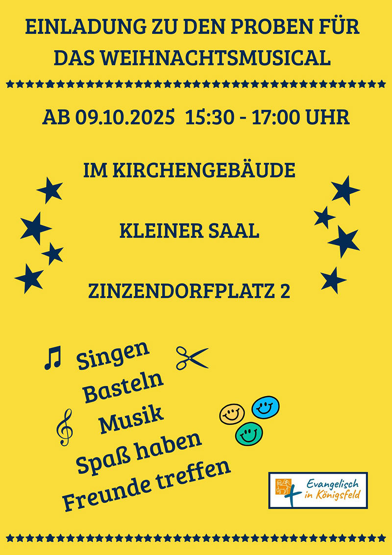 Die Proben finden ab Donnerstag, den 9. Oktober um 15:30 bis 17:00 Uhr im Kleinen Saal, Zinzendorfplatz 2, statt. Wir freuen uns auf alle kleinen und großen Leute, die mit uns singen, basteln, Musik machen und vor allem ganz viel Spaß haben wollen.